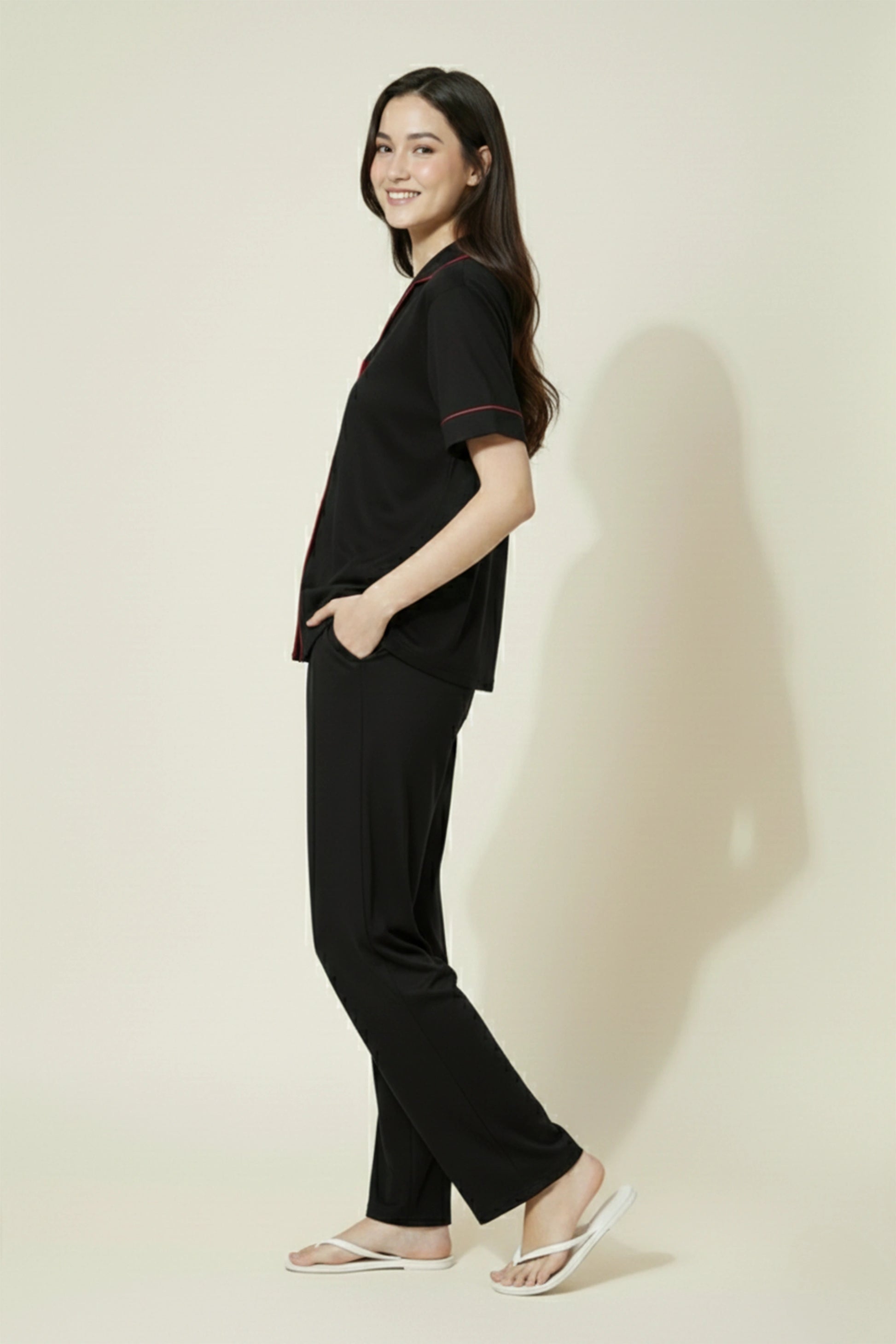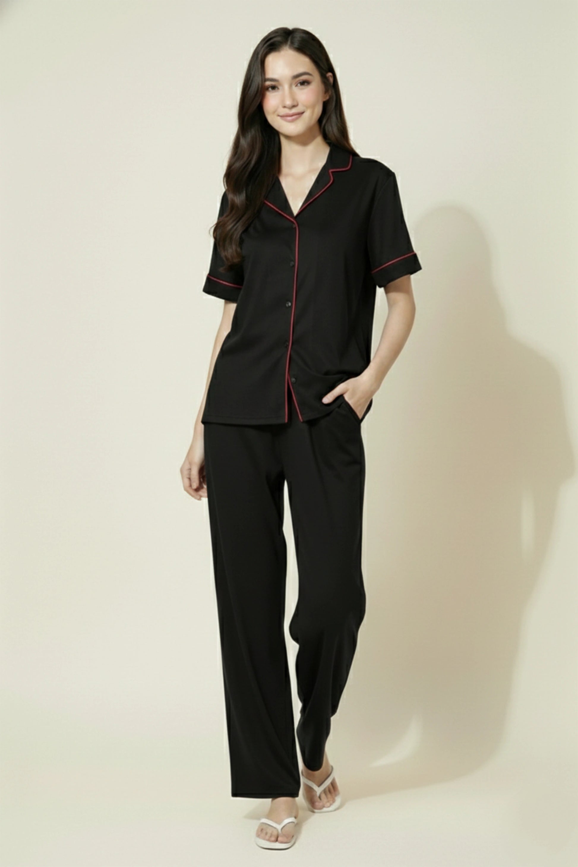 Payment methodsSoft, breathable and effortlessly elegant — this Black cotton night suit is designed for slow evenings and comfortable mornings. Finished with delicate contrast piping for a refined touch.