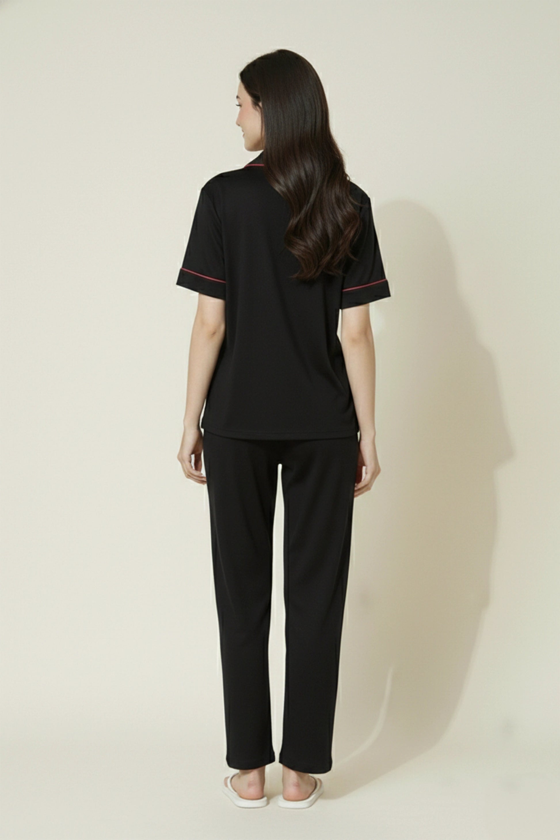 Black Cotton Night Suit for Women with Contrast Piping - Half Sleeve