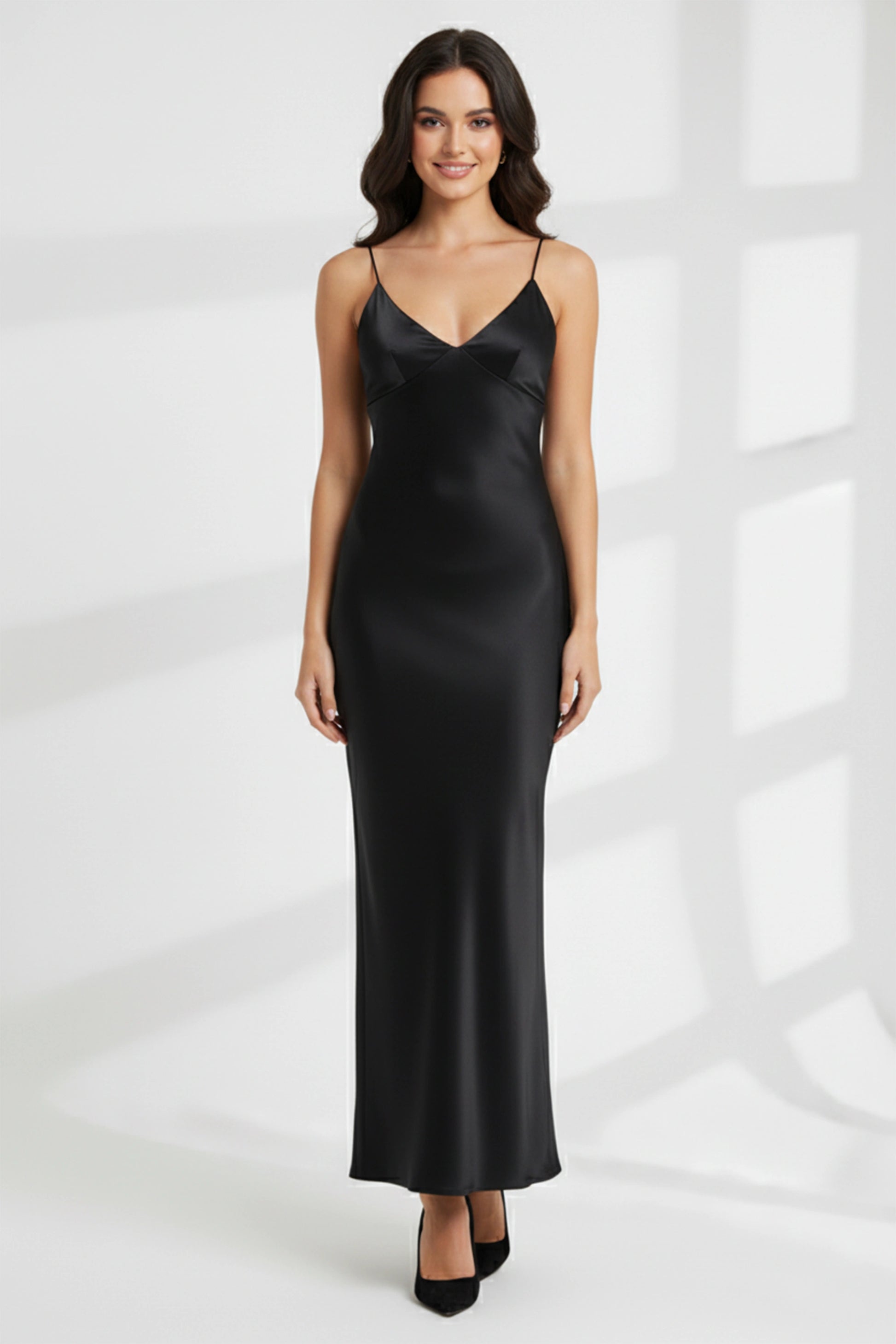 It features slender spaghetti straps, a refined V-neckline, and subtle paneling that enhances shape without clinging. The ankle-length hem adds sophistication, while the fluid drape makes it comfortable and flattering on all body types.