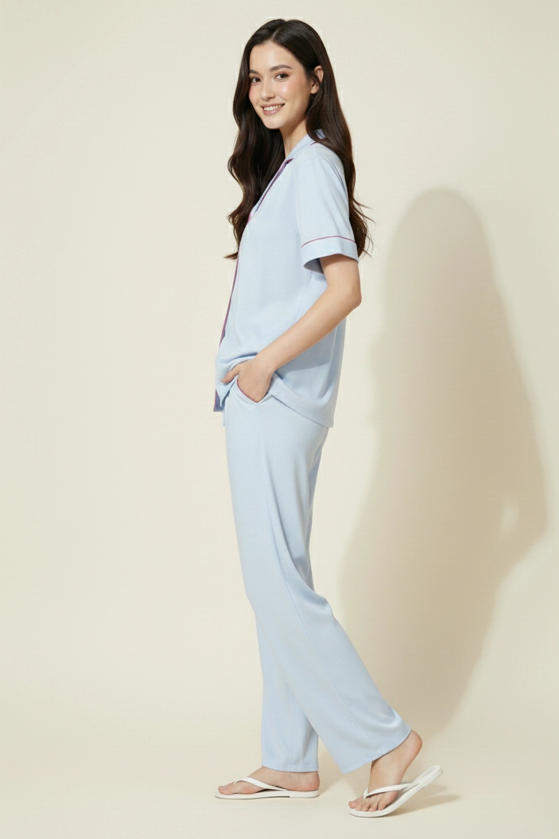 Crafted from lightweight, breathable cotton, this relaxed-fit set features a classic button-down shirt with full sleeves and subtle contrast piping that adds a clean, refined finish. The straight-fit trousers mirror the same piping detail, creating a cohesive and polished look.