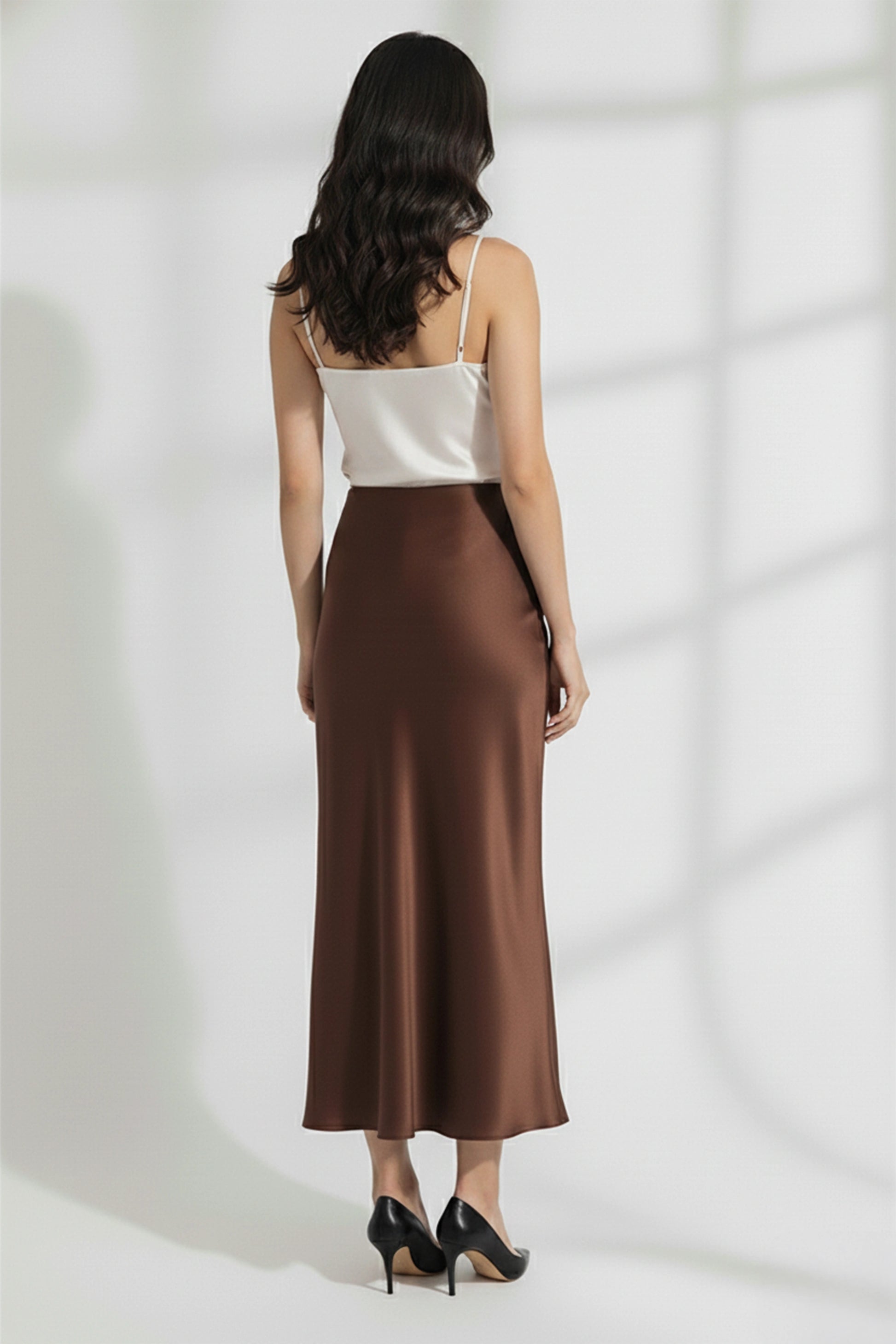 Effortlessly elegant, this satin skirt drapes beautifully with a fluid, lustrous finish. Designed with a smooth bias-cut silhouette and a hidden elastic waistband for added comfort, it flatters the body while allowing ease of movement. The rich wine hue adds a touch of sophistication, perfect for both day-to-night dressing.