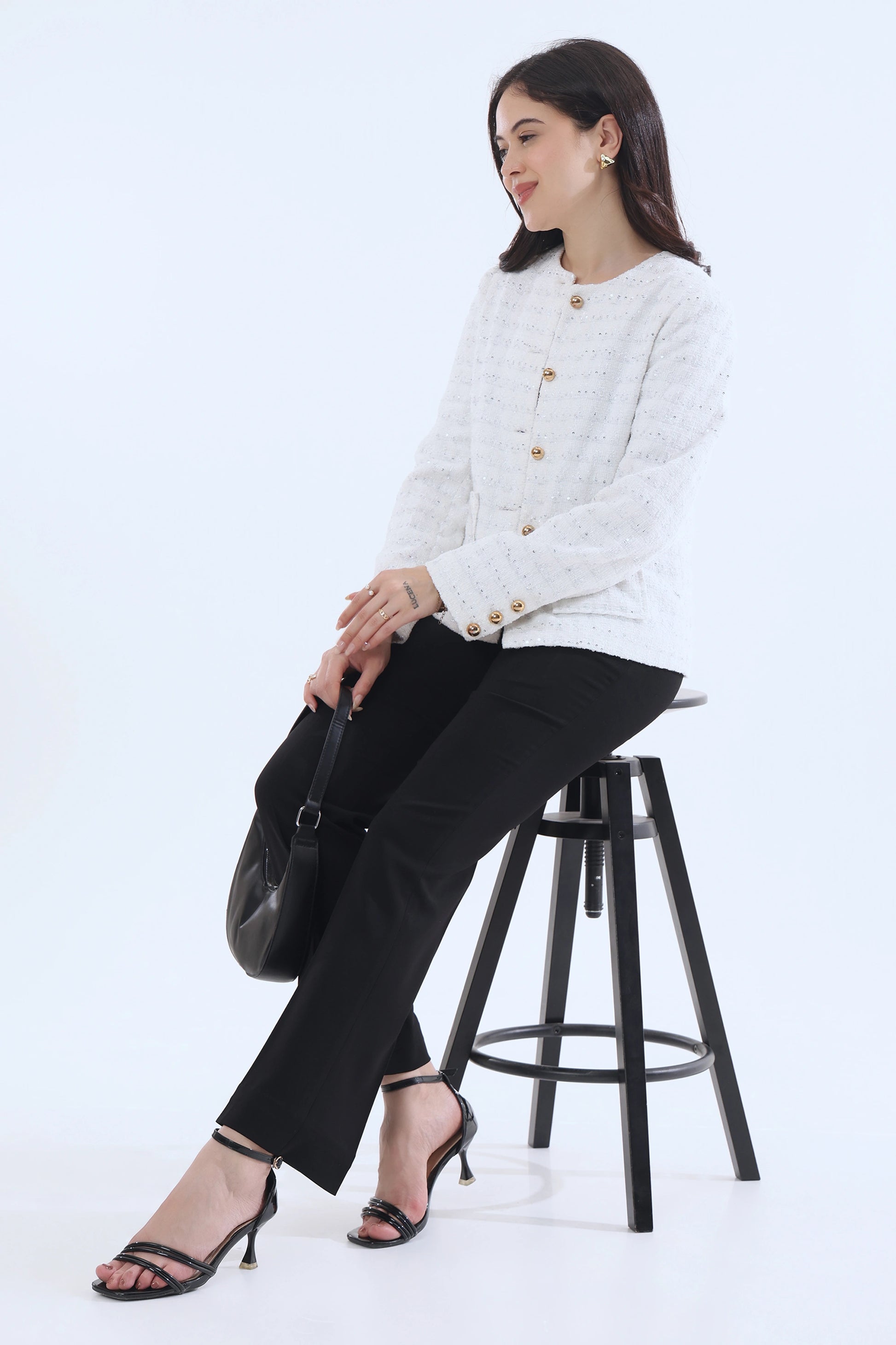 Versatile and effortlessly elegant, this jacket pairs perfectly with trousers, skirts, and dresses—your go-to layer for a chic, put-together look.