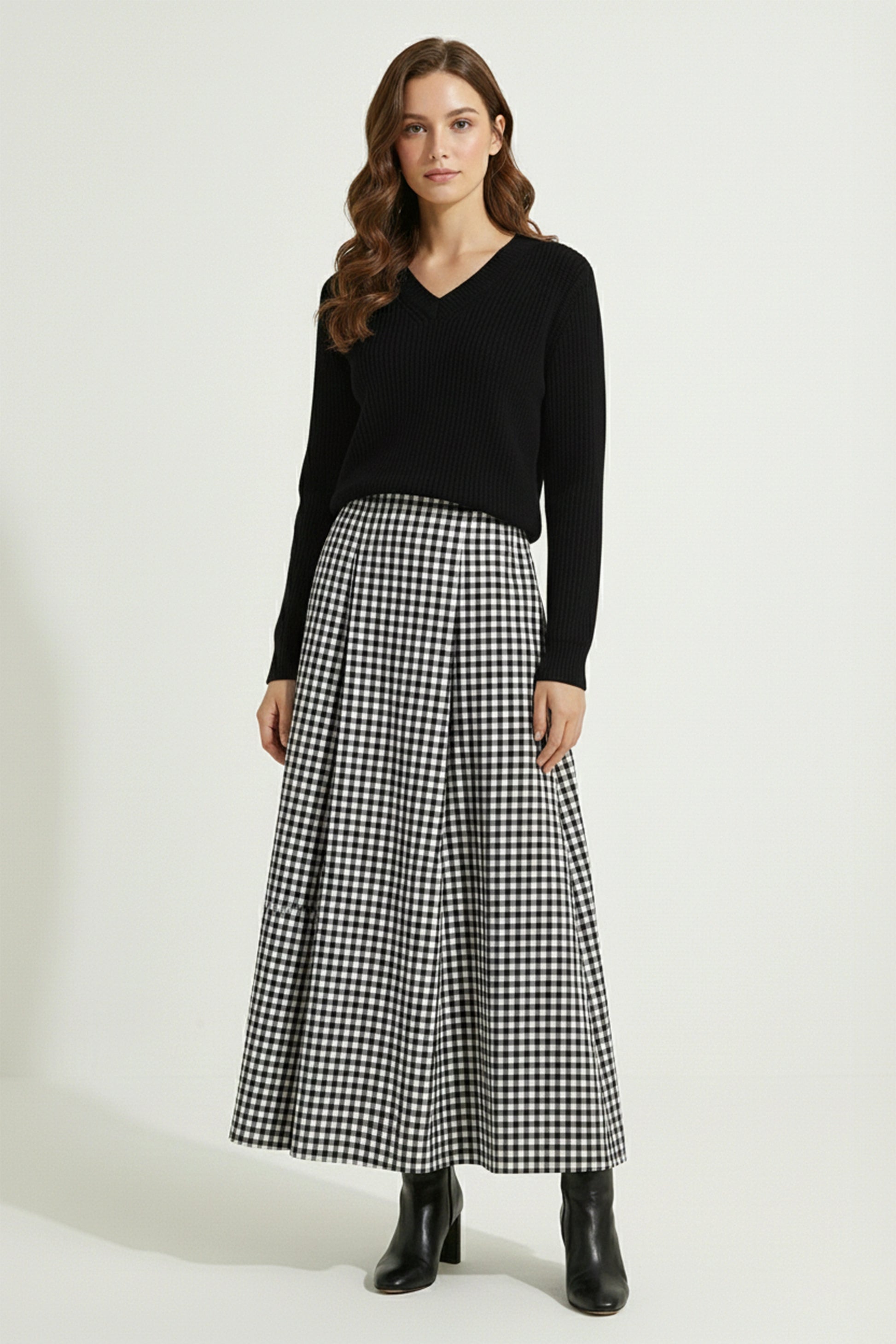 Nerra Frill Maxi Skirt in Black and White Gingham Checks prints, with a frill A- Line Silhouette. Elasticated waist at the back for comfort Fit. Pockets on each side.