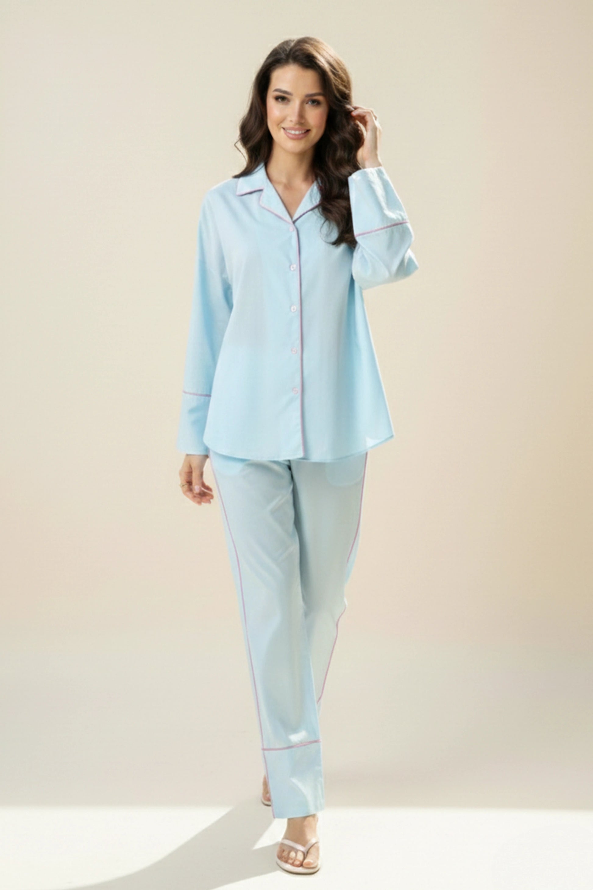 Payment methodsSoft, breathable and effortlessly elegant — this light blue cotton night suit is designed for slow evenings and comfortable mornings. Finished with delicate contrast piping for a refined touch.