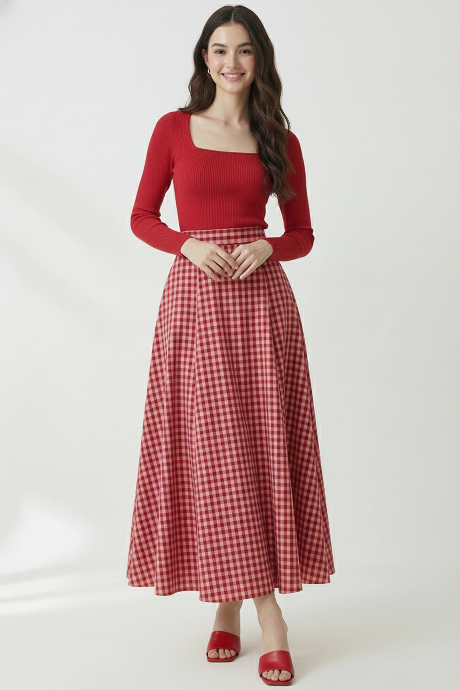 This red and pink checkered maxi skirt is a perfect blend of classic charm and modern femininity. Crafted in a timeless gingham pattern, it features a high-waisted fit with a softly flared silhouette that moves beautifully with every step. The structured waistband enhances the waistline, while the fluid fall of the skirt offers comfort and elegance throughout the day.