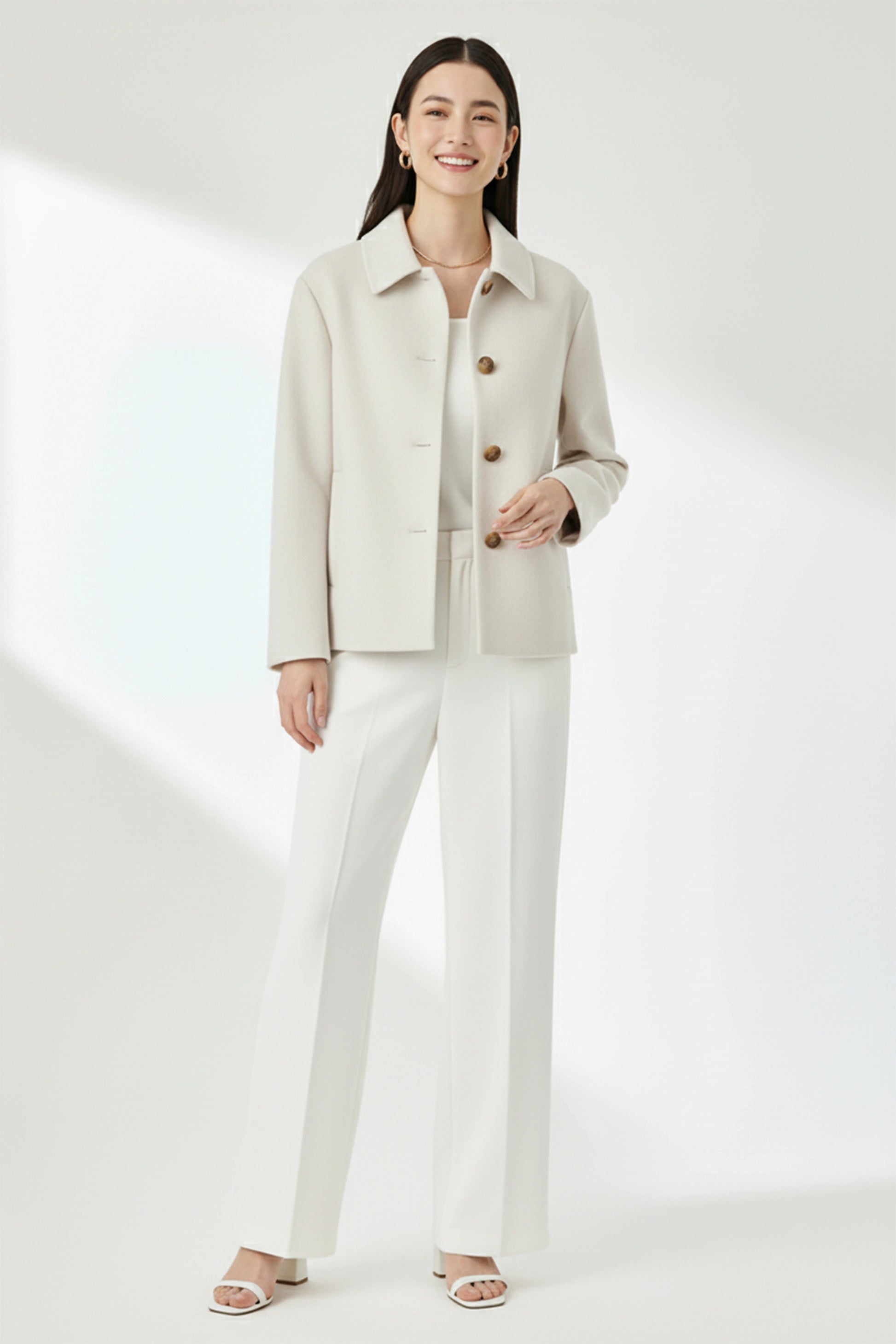 Crafted in premium felt fabric, this Ivory Felt Short Coat brings together clean tailoring and effortless sophistication. The smooth, structured felt offers a refined drape while keeping you comfortably warm, making it a perfect layering piece for cooler days. Designed with a sharp collar, classic tortoiseshell buttons, and a straight, minimal silhouette, it delivers a polished look without compromising on comfort. Subtle side pockets and neatly tailored sleeves enhance its versatility, allowing you to pair it seamlessly with trousers, dresses, or skirts. Whether for work, travel, or an elevated everyday look, this jacket adds timeless elegance to any outfit.